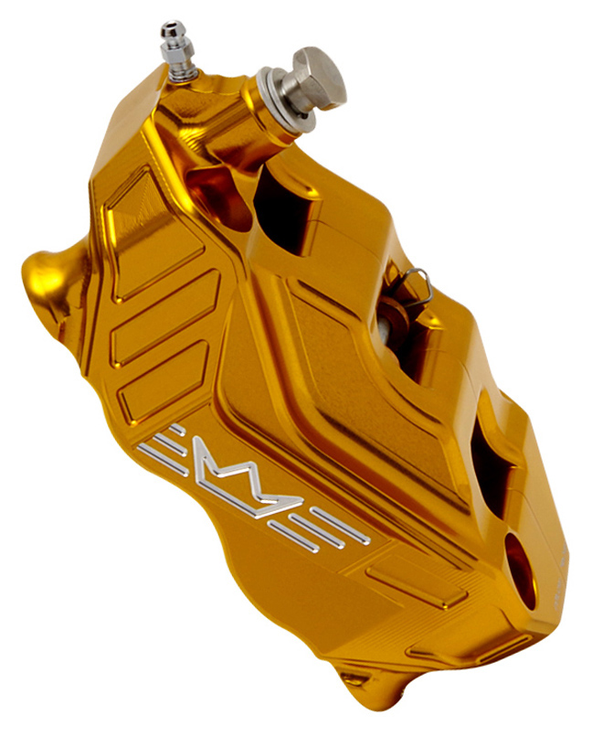 RR108 brake calipers feature radial technology for uncompromised performance! CNC machined from top quality billet aluminum for strenght and reliability they have passed the strictest stress tests. Thanks to a 27 squared centimeters friction area (one of the largest on the market), RR108 radial brake calipers deliver great braking power and are ideal for application on all V-Twin motorcycles with stock front ends or Öhlins front forks. These high performance brake calipers are the ideal solution for Harley’s equipped with ABS braking systems. RR108 brake calipers come with sintered brake pads and feature four 32mm diameter stainless steel pistons for optimal heat dissipation. Traditional brake calipers are not tied at the center and while braking tend to expand and disperse braking power; RR108 radial brake calipers overcome this issue thanks to four bolts fixed in very precise points, which allow the perfect rigidity and the best braking performance. Another important feature is that RR108 brake calipers have oil seals as well as dust shields, which ensure that dust and dirt do not get on the pistons, which could compromise performance and safety. These high performance jewels are available in several anodized colors for great looks and durability! RR108 anodized calipers do not fade over the years (like many other anodized components). The secret is an indelible pigment used in the anodizing process, which does not fade even at high temperatures.