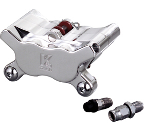 4-piston brake calipers are a perfect match to our sprocket rotor kits. These are the smallest 4-piston calipers available on the market. All hardware is hidden for a very smooth and clean look. Caliper brackets are sold separately and fit HD type forks up to 1999 style (not 2000-up twin cam forks). NOTE: we suggest to use DOT 4 brake fluid. in any case do not use silicon based oils.