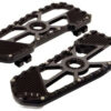 Bagger floorboards are CNC machined from top grade billet aluminum and beautifully black anodized. They are 12.6″ (32 cm) long and 5″ (12.5 cm) wide. Bagger footrests are direct bolt-on replacements for several Harley-Davidson models: 1986-up touring and trike models; 2012-16 FLD’s; 1986-17 FL Softail models. They are very easy to install, reusing your stock Harley mounting hardware.These sleek floorboards feature three integrated spike inserts to allow excellent foot grip. Available in solid black or with edges anodized in different colors to complement the colors of custom bike project!