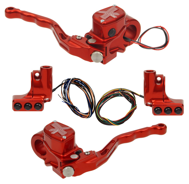 hand controls RR90X radial brake master cylinder w/ brake switch for dual caliper + hydraulic clutch w/out switch + 3-button switch clamps w/ mirror hole – red
