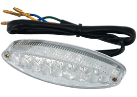 Ice taillight features clear LED bulbs, which turn red when you brake or turn on the taillight. Features two brightness levels for run and brake light. Available with clear, red or smoked lens. Taillight dimensions: width 4″, height 1-1/16″, depth 2-1/4″.