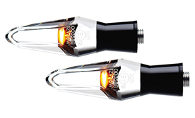 Our Mini turn signals feature a completely clear body and an aluminum mount for a super cool look! They turn amber when activated. They feature specifically selected, high output LED’s with maximum efficiency and 7W total output, IC controlled constant power source with 330 kHz pulses and special collimator optics, that precisely bundle the emission light from the LED’s into the plastic body. Aluminum mounts are available polished or black anodized. They fit in 8mm mounting holes and can be used as front or rear turn signals. Lenght: 3.27″ – Max diameter: 0.8″. Sold in pairs.